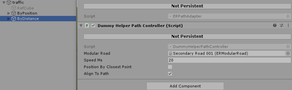 3. Add DummyHelperPathController (another sample script) to any object to move it along the path Input: ERModularRoad - road object to follow speedMs - move velocity in m/s positionByClosestPoint - position object by closest point or by closest distance alignToPath - enable/disable path following (useful to check path alignment for objects out of path in different configs)